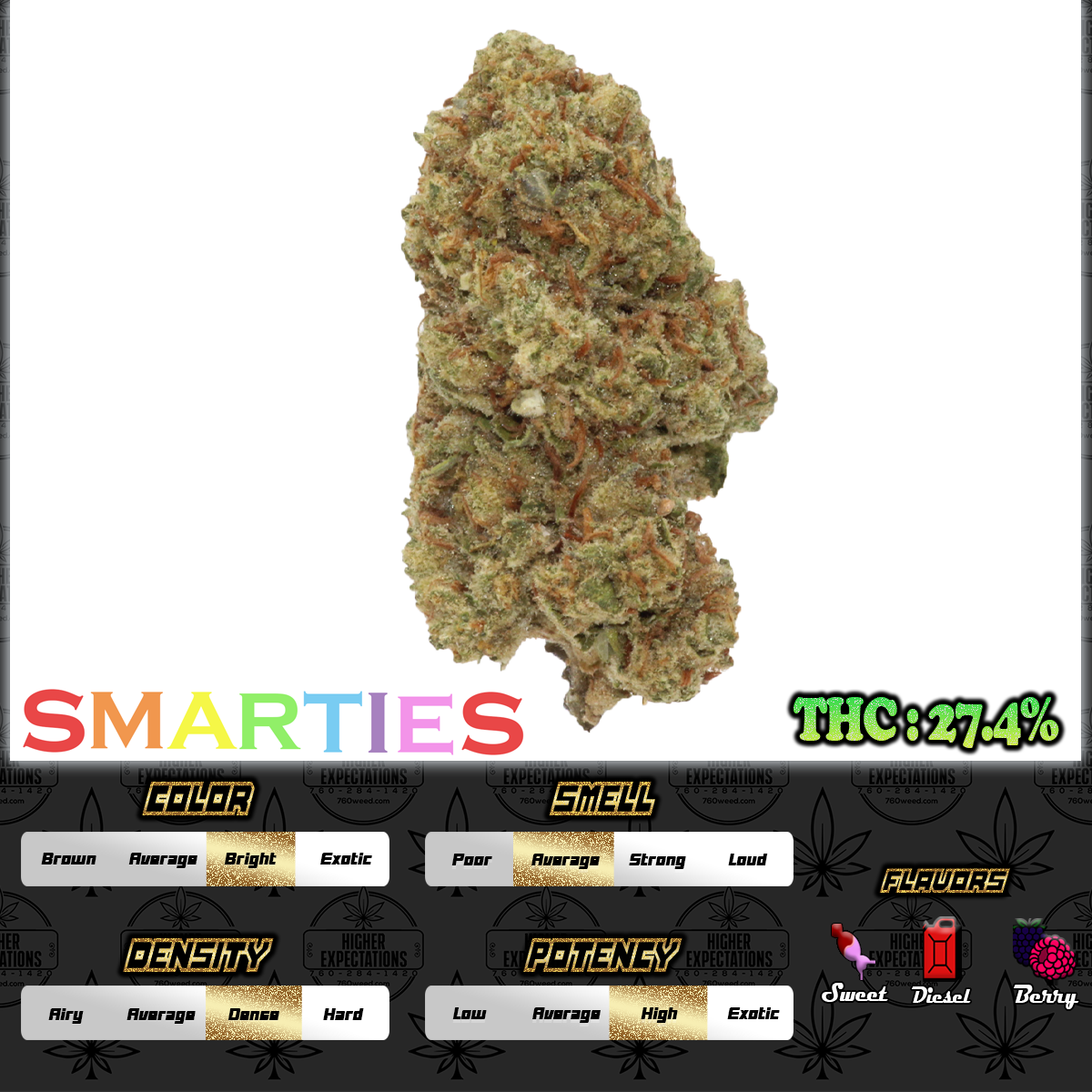 A vibrant hybrid strain recognized for its sweet, candy-like aroma and smooth, approachable flavor. It delivers a balanced experience that many customers find uplifting yet mellow, making it suitable for a variety of occasions. With its appealing taste and consistent effects, Smarties is a popular choice for those seeking a flavorful and well-rounded strain.